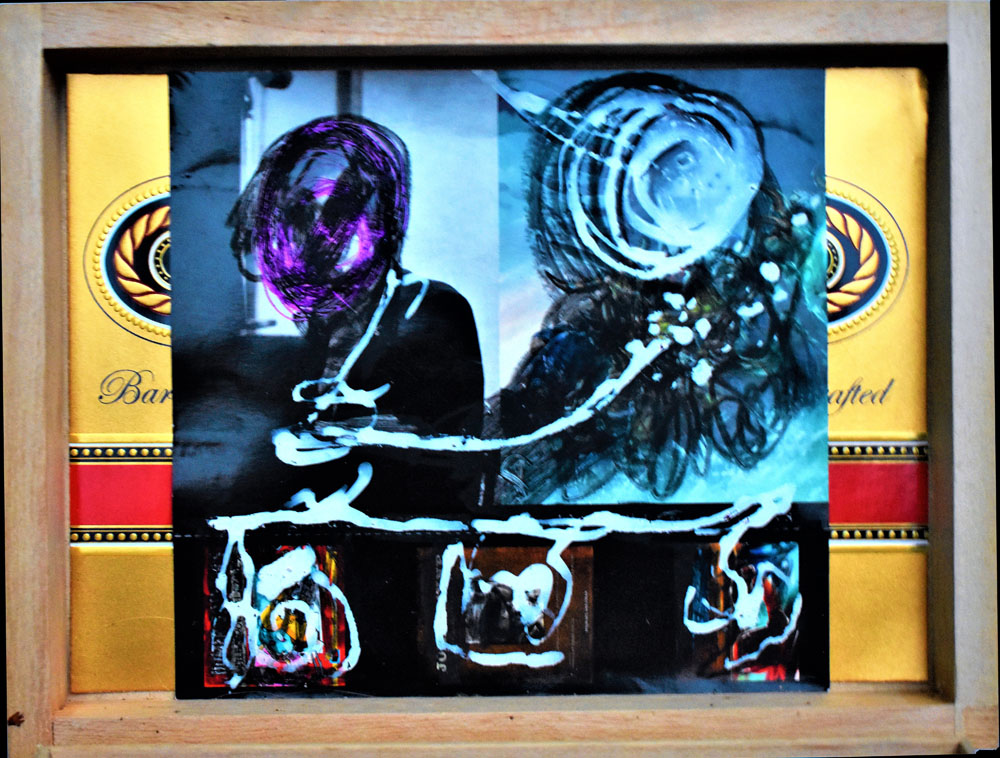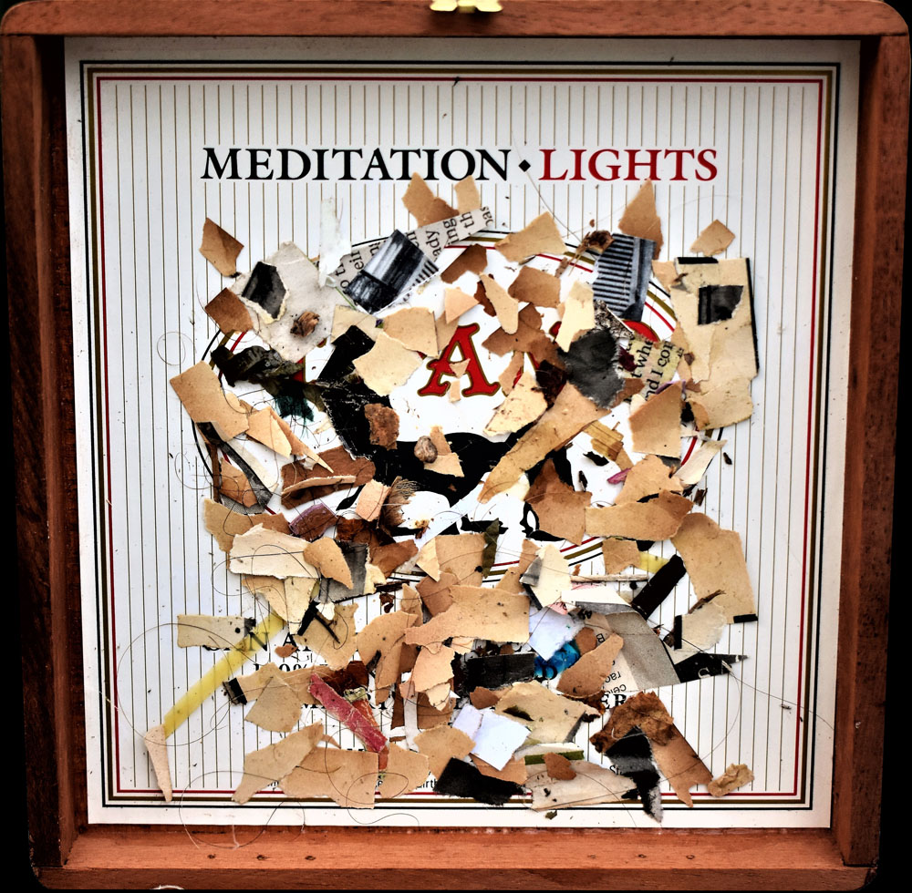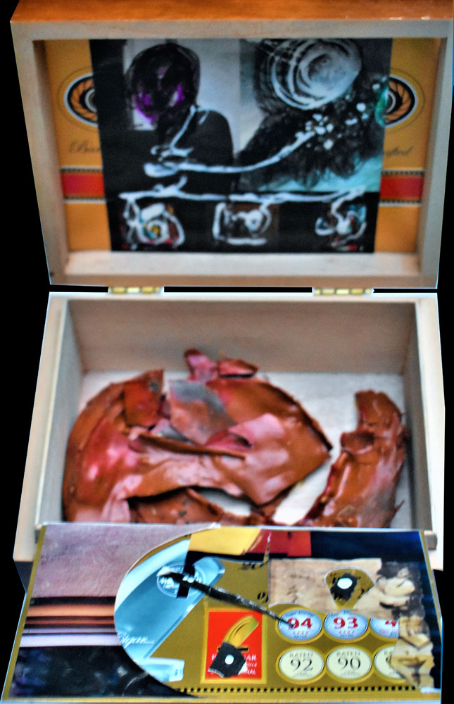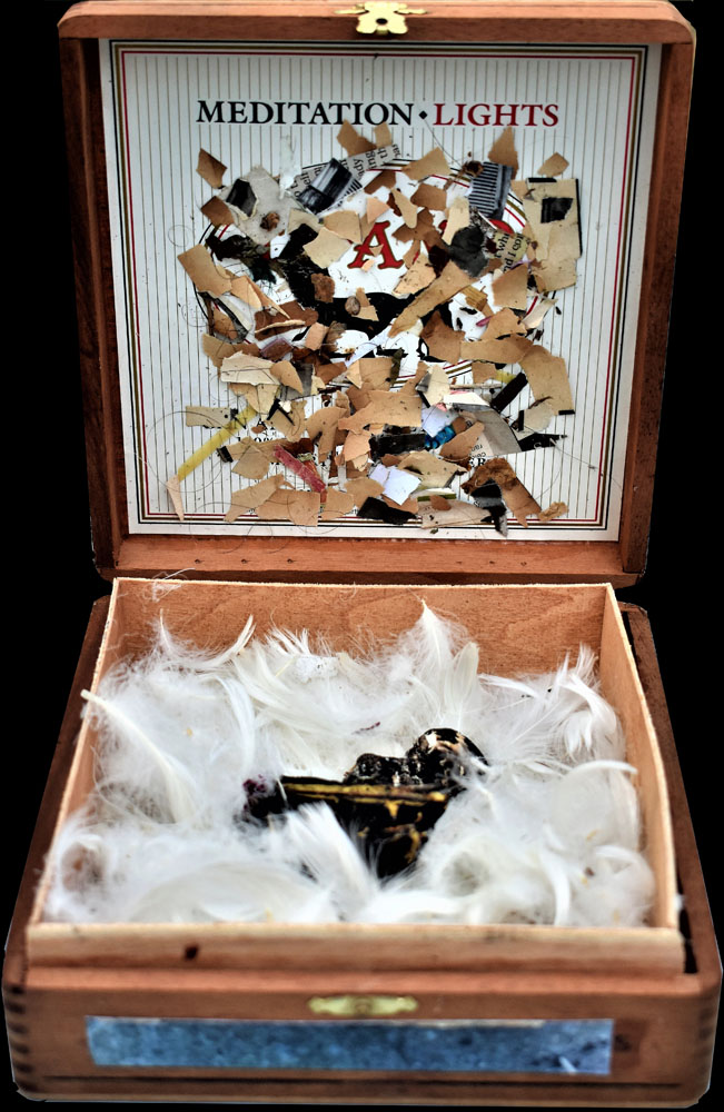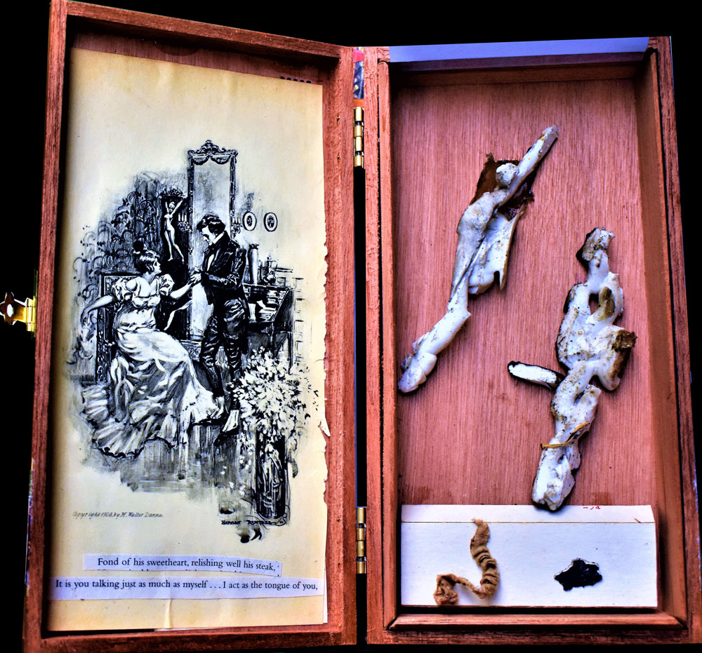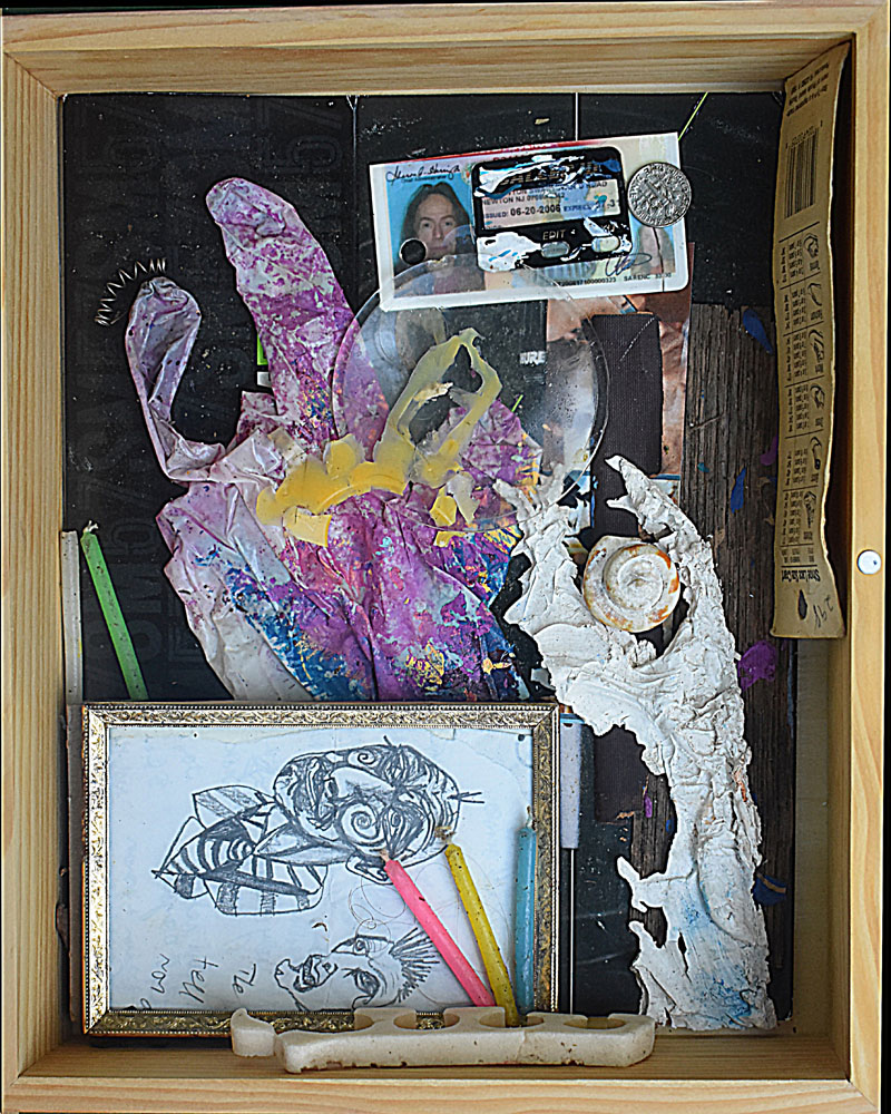 The Combines of Mixed Media, Found & Fabricated Objects, Organium, recomposed Decomposition, Fummage , dust, rust, crust, tree bark, ashes, bronze, ceramics, pearls, fabric, dried flowers, or unidentifiable combinations with dismembered objects renewed, reassembled, etc… all combined into or within non-artistic or non-aesthetic materials with emphasis on the adaptation of conjecture within a wooden, metal, paper, Plexiglas or another enclosed or open ended space.